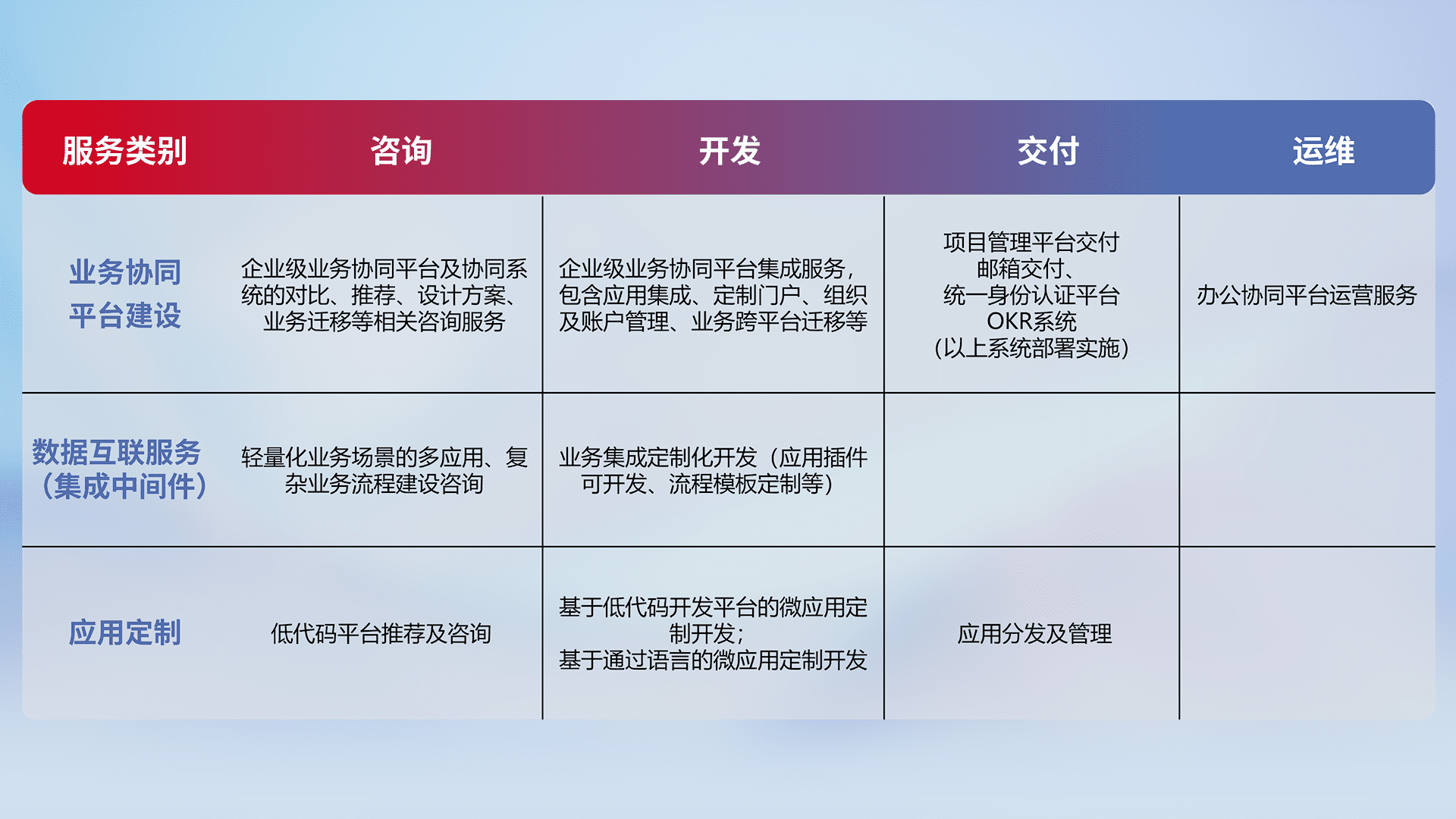 针对钉钉、、、、企微、、、、IDaas等平台级产品提供产品的规划、、方案、、、交付、、、定制化开发等服务,,,实现如统一协同办公、、、、智能客户服务、、混合会议管理、、、智能数据查询、、等业务场景,,,,实现数字化转型。。