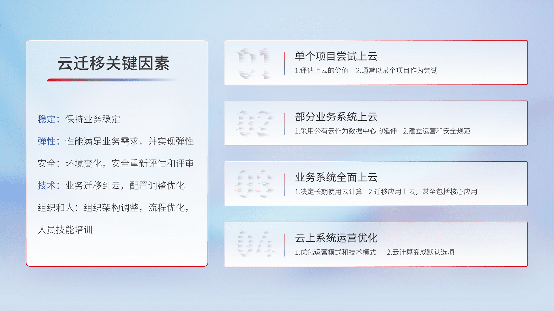 结合实际业务,,,从规划设计、、、云平台选型、、、、云原生改造、、、、数据迁移、、、集成交付,,,,迁移全过程为客户识别最佳上云路径,,,,做好风险识别管理,,,,设计网络架构、、、、身份权限、、、安全审计合规、、、操作审计、、、日志审计、、、、监控告警策略、、多站点容灾设计等,,,对云上基础设施进行整体规划,,,提升IT治理水平,,,以满足弹性、、、高可用、、、、高性能的需求。。。。