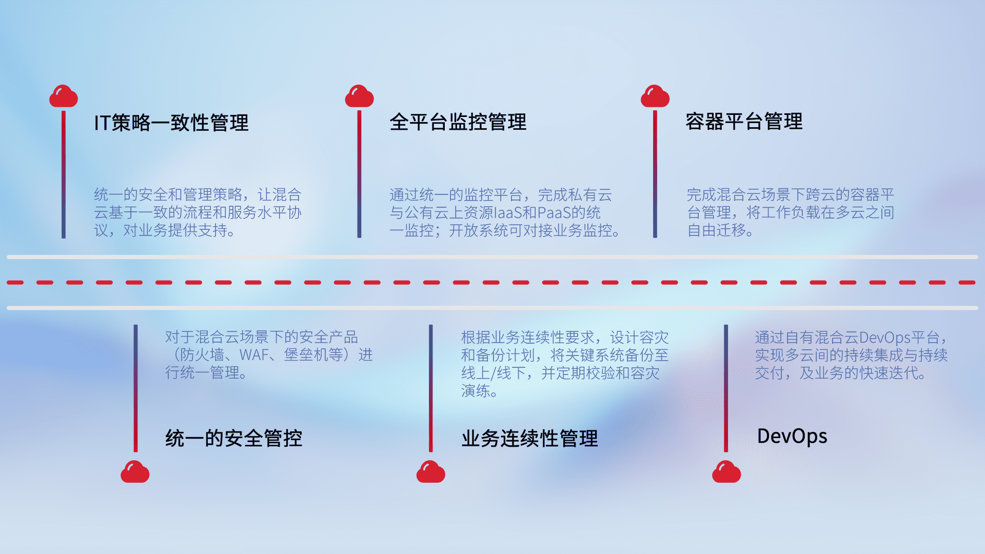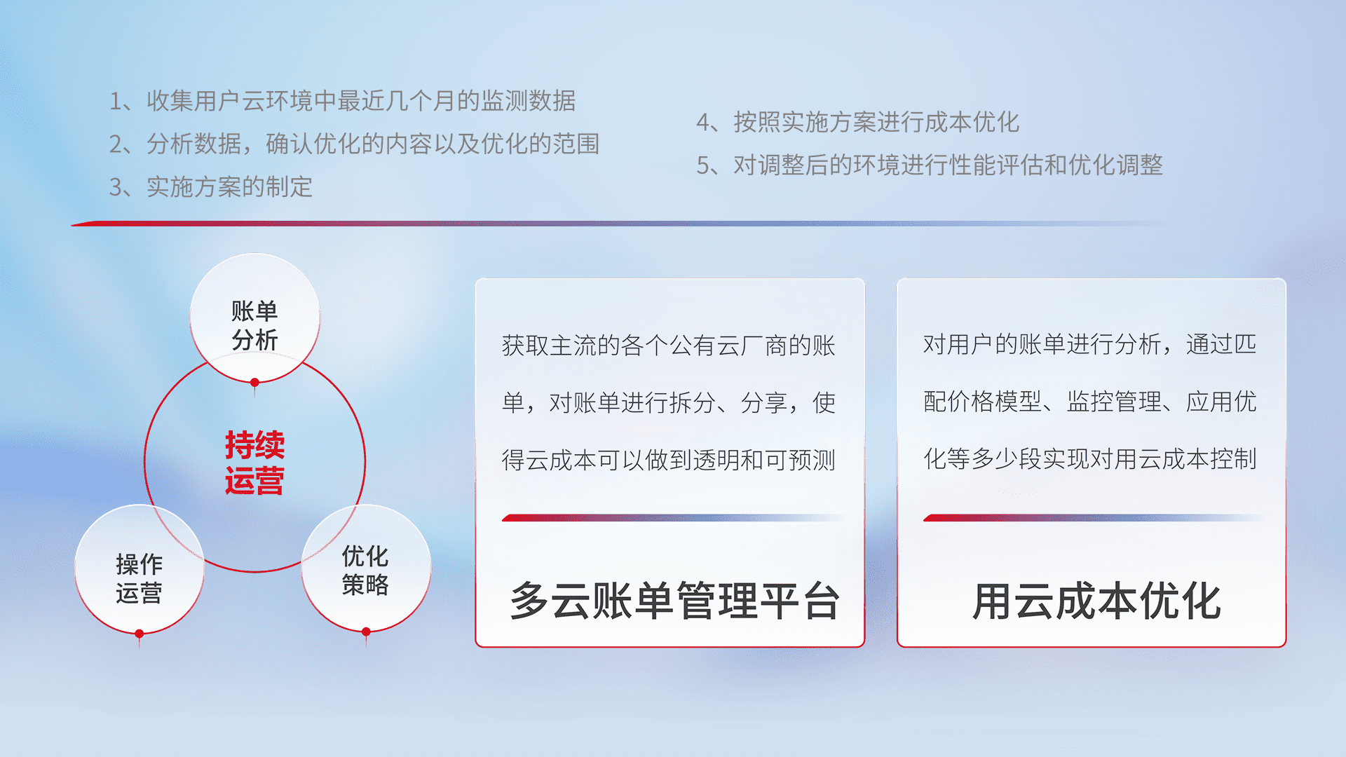 通过多云纳管,,,以统一的资源数据模型把客户的云资源进行抽象和封装,,,,进而实现对多云资源的统一操作,,,保障云资源管理的可靠性、、稳定性与可用性。。量身定制化运维内容,,配置、、开发运维、、、、补丁管理、、、备份、、监控、、、、认证和访问管理、、审计和日常巡检等,,保障在用云过程中的可靠度,,,稳定度以及高可用率。。